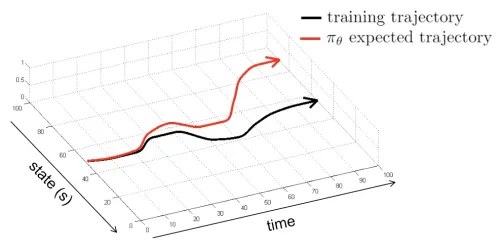 The training trajectory represents the ground truth demonstrated by human experts. As you can see, the difference between the policy and the ground truth grows increasingly large over time. This makes naive behavioral cloning not work.