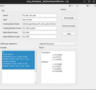 Even though pixi wasn’t the right fit for the lecture environment preparation, it helped me out a lot on my own project this week. I used the preview feature pixi-build-ros to successfully build IFL-CAMP/easy_handeye: Automated, hardware-independent Hand-Eye Calibration! It only took me one day to set up the calibration framework and finish the eye-on-base calibration.